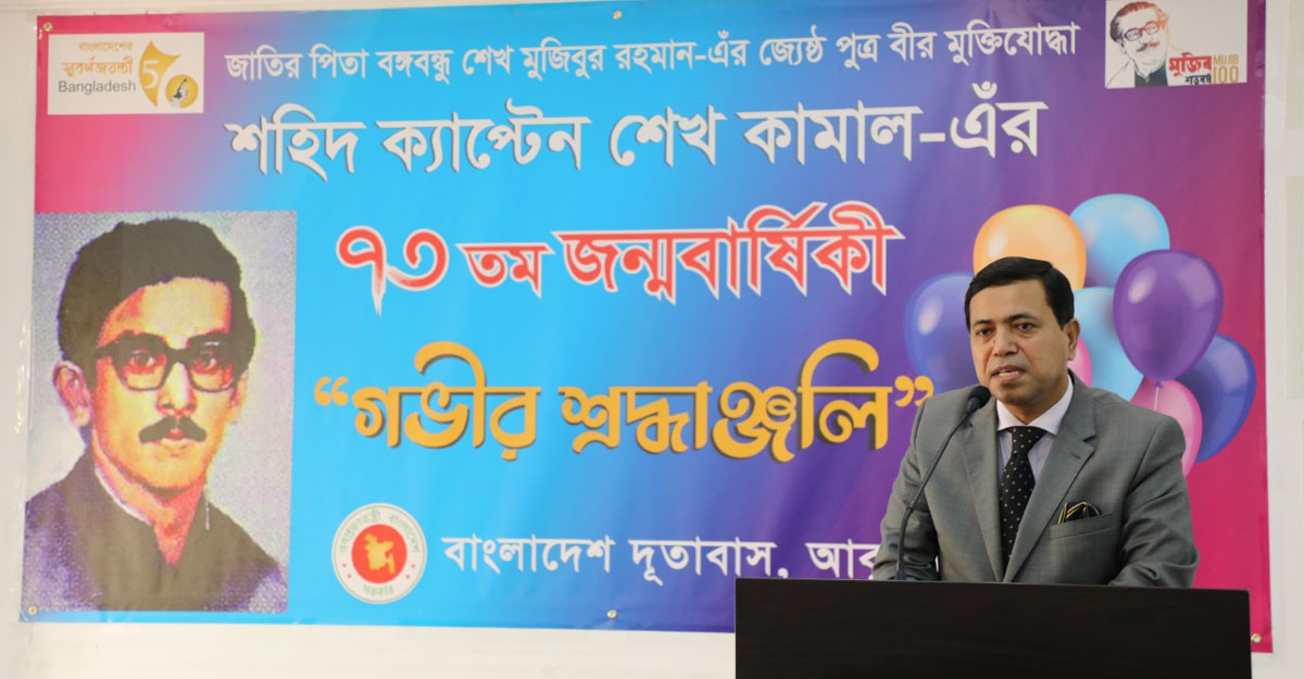 সংযুক্ত আরব আমিরাতের রাজধানী আবুধাবিতে বাংলাদেশ দূতাবাসে জাতির জনক বঙ্গবন্ধু শেখ মুজিবুর রহমানের জ্যেষ্ঠ পুত্র বীর মুক্তিযোদ্ধা শহীদ ক্যাপ্টেন শেখ কামালের ৭৩তম জন্মবার্ষিকী যথাযোগ্য মর্যাদায় উদযাপন করা হয়েছে।
