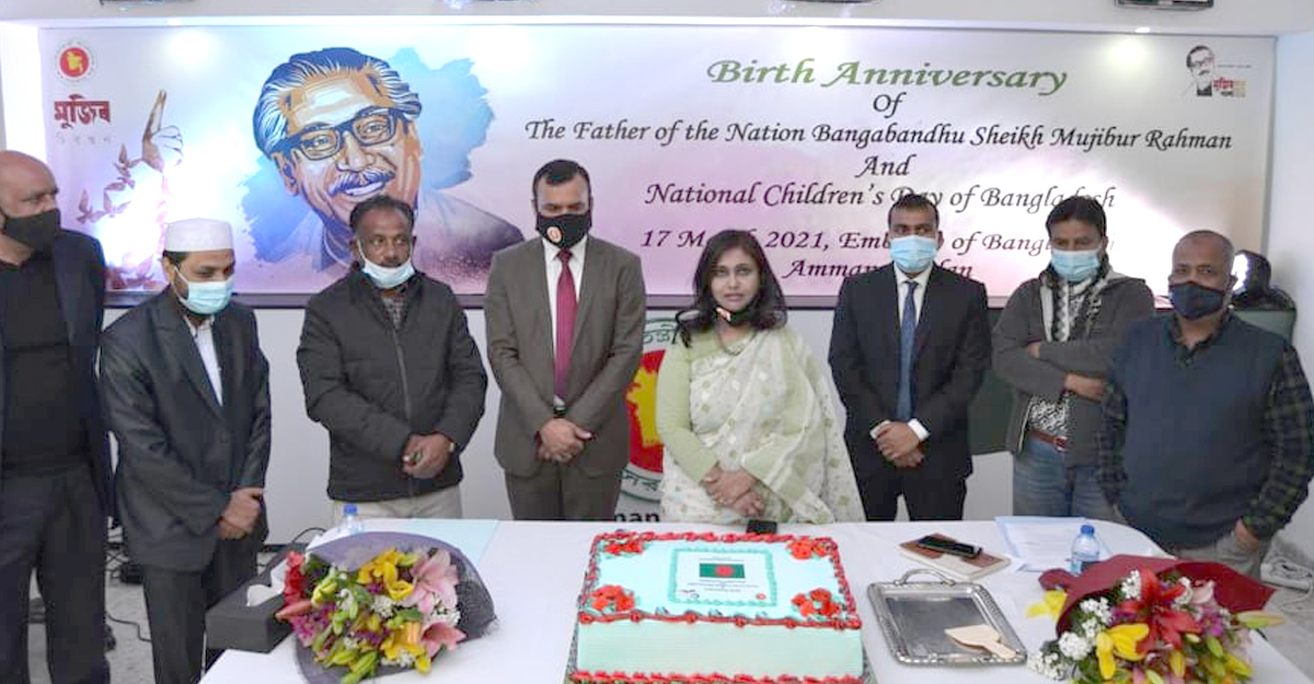 জর্ডানের বাংলাদেশ দূতাবাসে শ্রদ্ধা ও ভালোবাসায় বঙ্গবন্ধু শেখ মুজিবুর রহমানের জন্মবার্ষিকী পালন করা হয়েছে। দেশটিতে নিযুক্ত বাংলাদেশের রাষ্ট্রদূত নাহিদা সোবহান বুধবার (১৭ মার্চ) সকালে জাতীয় সংগীতের সঙ্গে জাতীয় পতাকা উত্তোলন করেন এবং বঙ্গবন্ধুর প্রতিকৃতিতে ফুল দিয়ে শ্রদ্ধা জানান।