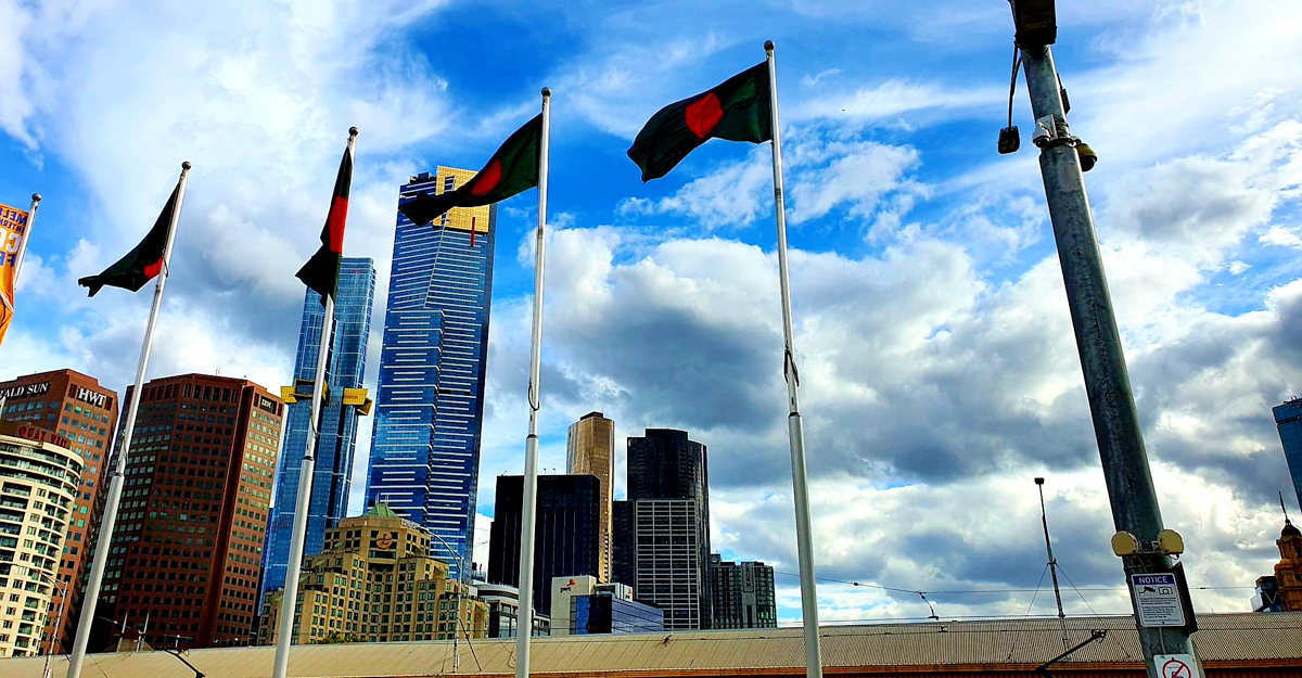 মেলবোর্ন শহরের গুরুত্বপূর্ণ স্থান ফেডারেল স্কয়ারে শোভা পায় চারটি বাংলাদেশি পতাকা। দিনব্যাপী এ পতাকা ওড়ানোর অফিসিয়াল অনুমোদন দেয় ফেডারেল কর্তৃপক্ষ। শুক্রবার (২৬ মার্চ) এ দৃশ্য মন ভরিয়ে দেয় মেলবোর্ন বাংলাদেশিদের। অস্ট্রেলিয়াস্থ বাংলাদেশ দূতাবাসের সমর্থন নিয়ে এ আয়োজনে মূল ভূমিকা পালন করে মেলবোর্ন-বাংলাদেশি কমিউনিটি ফাউন্ডেশন। প্রায় ৮ বছর ধরে এ কাজটি করে আসছেন তারা।