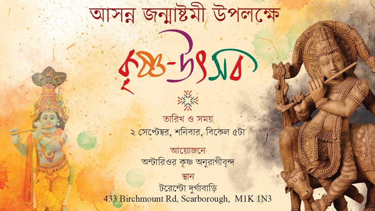 আসন্ন জন্মাষ্টমী উপলক্ষ্যে আগামী ২ সেপ্টেম্বর, শনিবার কানাডার টরন্টোতে কৃষ্ণ-উৎসবের আয়োজন করা হয়েছে। অন্টারিওর কৃষ্ণ অনুরাগীদের পক্ষে এই আয়োজনে পাঁচ হাজার বছর আগের মহান ব্যক্তিত্ব মানব জাতির অন্যতম শ্রেষ্ঠ সন্তান শ্রীকৃষ্ণকে কেন্দ্র করে থাকবে আলোচনা, সংগীত, নৃত্য, কবিতা ও অন্যান্য অনেক অনুষঙ্গ। অনুষ্ঠান পরিচালনায় থাকবেন নন্দিত দুই লেখক ও উপস্থাপক চয়ন দাস এবং দেবাঞ্জনা মুখার্জি ভৌমিক।