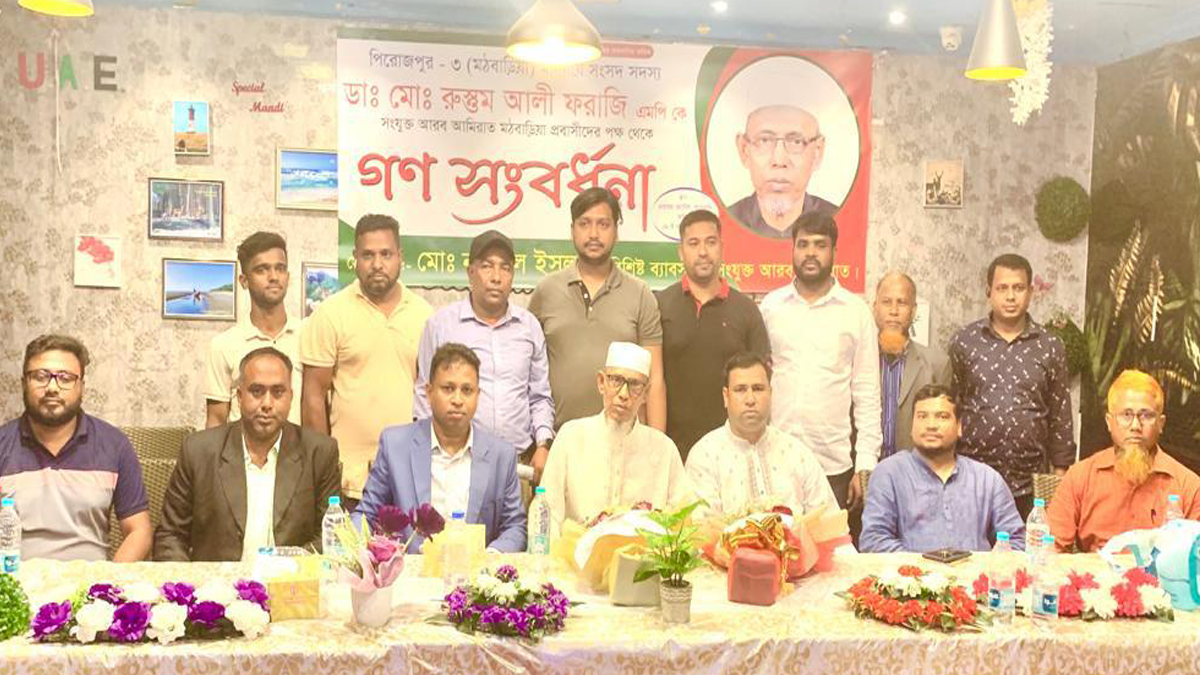 সংযুক্ত আরব আমিরাতে সফররত ফিরোজপুর-৩ (মঠবাড়িয়া) আসনের সংসদ সদস্য ডা. মুহাম্মদ রুস্তম আলী ফরাজিকে গণসংবর্ধনা দিয়েছে আবুধাবিস্থ মঠবাড়িয়া উপজেলা ও বরিশালের প্রবাসী বাংলাদেশিরা।