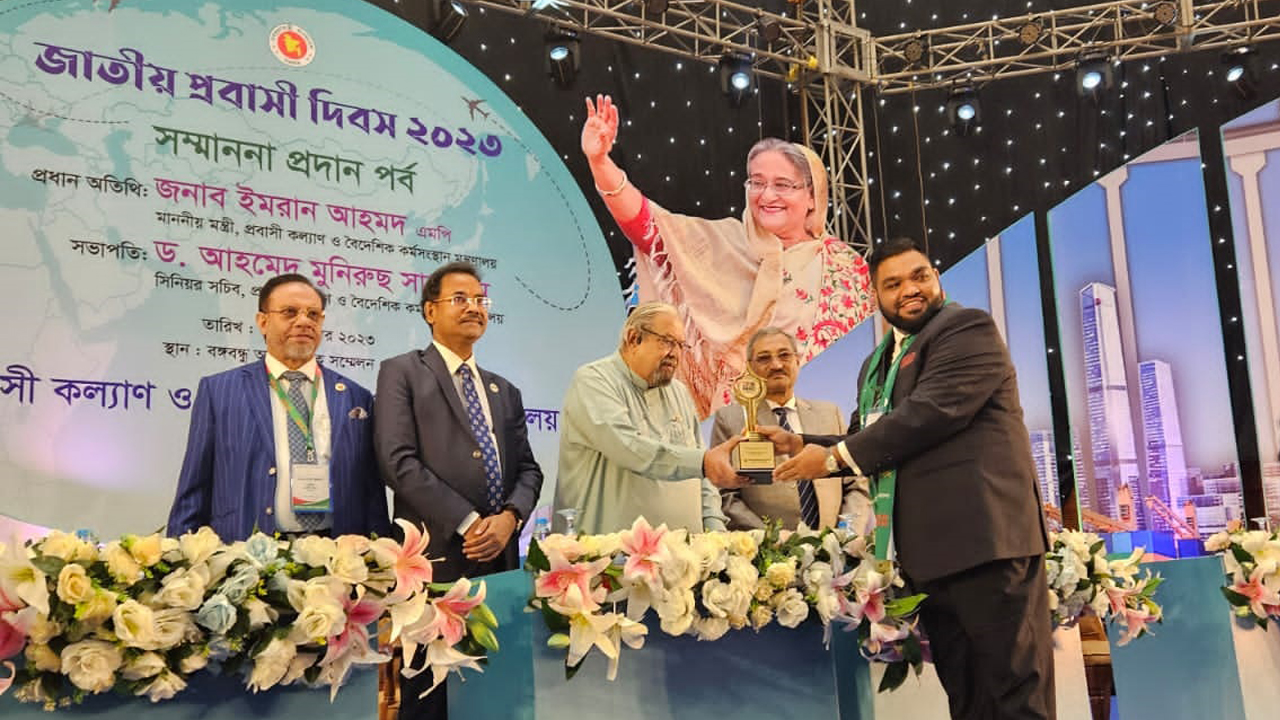 শনিবার (৩০ ডিসেম্বর) বিশ্ব প্রবাসী দিবস উপলক্ষে রাজধানীর বঙ্গবন্ধু আন্তর্জাতিক সম্মেলন কেন্দ্রে প্রবাসী কল্যাণ ও বৈদেশিক কর্মসংস্থান মন্ত্রণালয়ের মন্ত্রী ইমরান আহমদ তাকে এ সম্মাননা প্রদান করেন।
