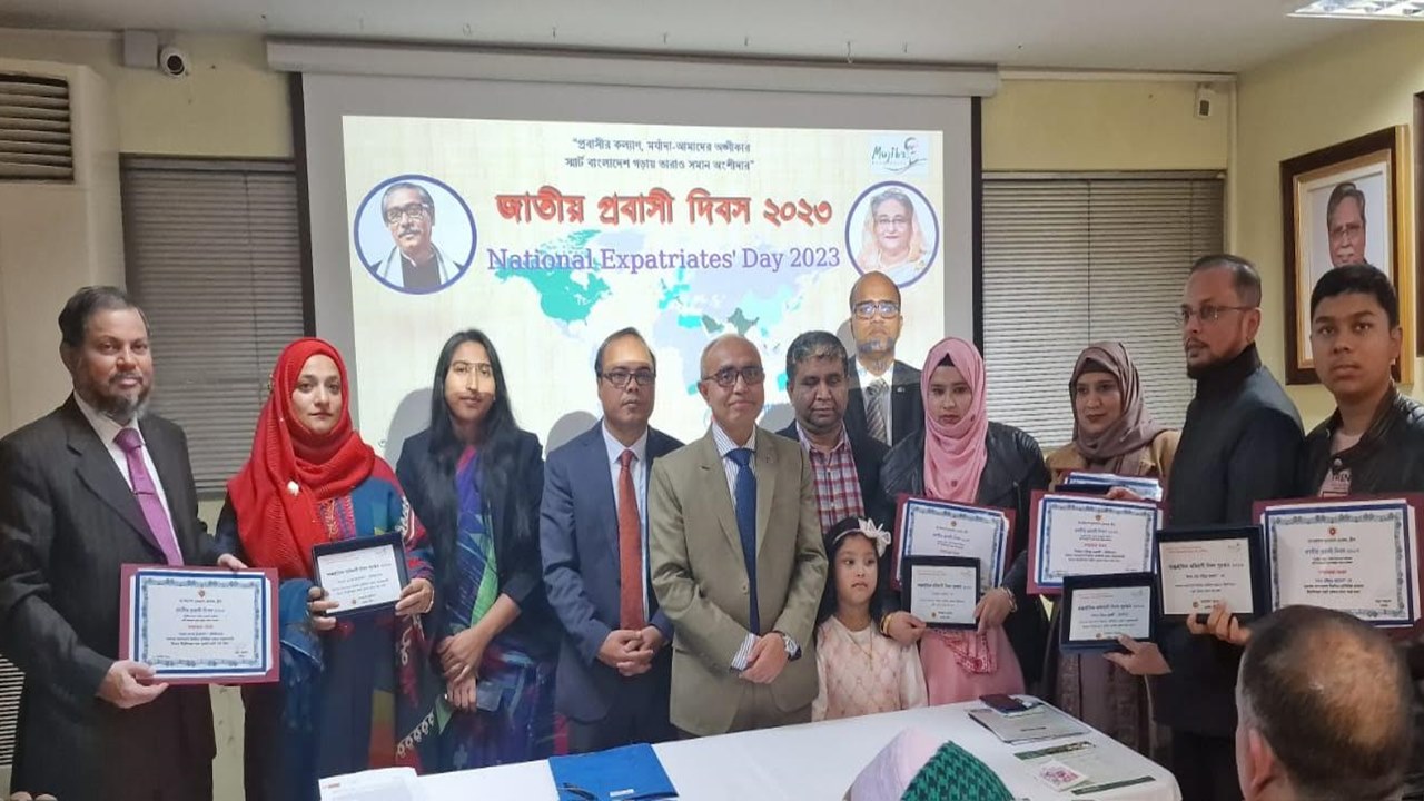 জাতীয় প্রবাসী দিবস ২০২৩ উপলক্ষ্যে দূতাবাস রেমিটেন্স প্রেরণে সহায়তাকারী দুইটি প্রতিষ্ঠান ভয়েস বাংলা ট্রাভেলস ও ইসলাম মফিদুল এজেন্সি ও সর্বোচ্চ রেমিট্যান্স প্রেরণকারী পাঁচজন প্রবাসী পারভীন সরদার, মো. আব্দুল্লাহ আল-মামুন, সাবিনা ইয়াসমিন, মো. সাইদুর রহমান ও মানসুরা আক্তারকে “আন্তর্জাতিক অভিবাসী দিবস পুরস্কার ২০২৩” পুরস্কারে ভূষিত করে।