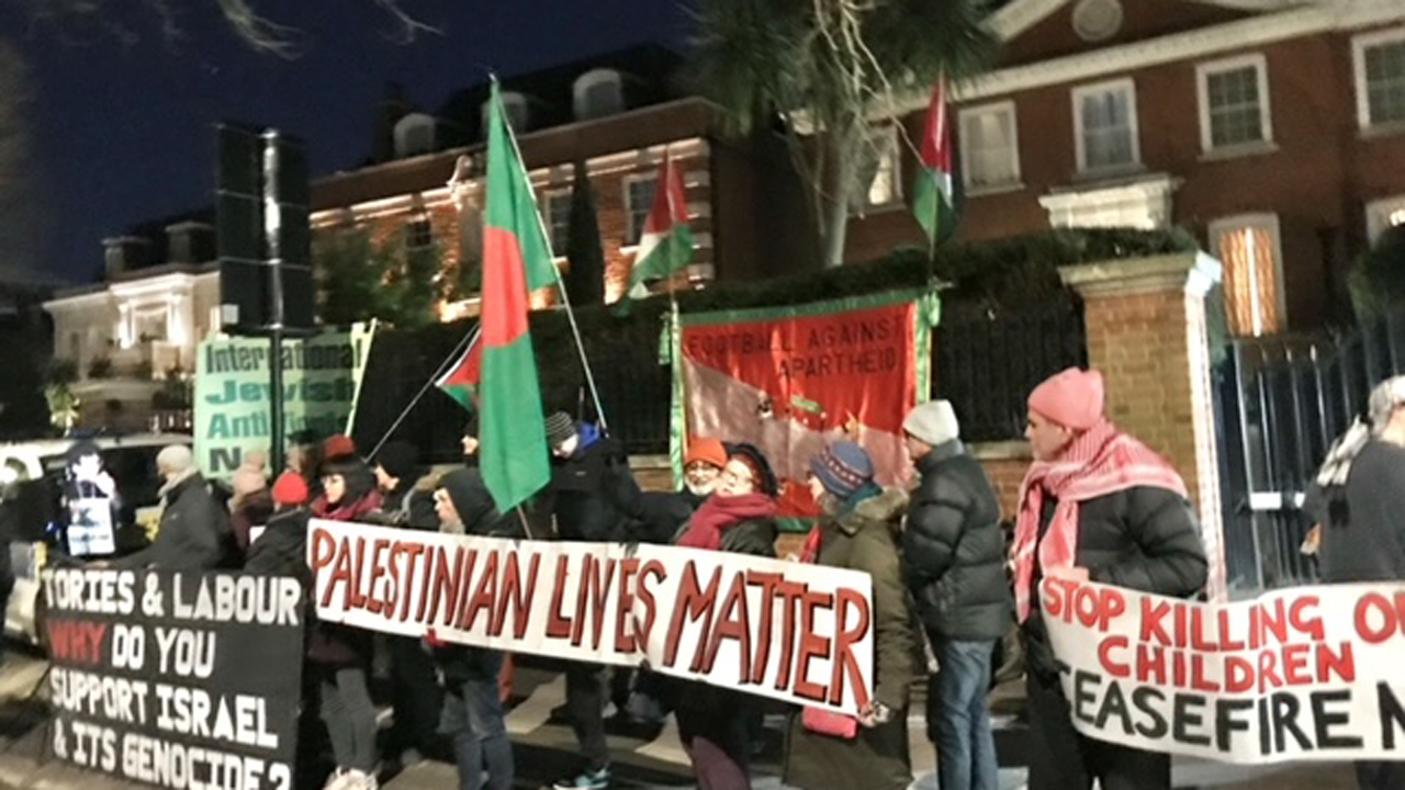 সম্প্রতি লন্ডনে ইসরায়েলি রাষ্ট্রদূতের বাসভবনের বাইরে আয়োজিত এক বিক্ষোভ সমাবেশ থেকে এ আহ্বান জানানো হয়।