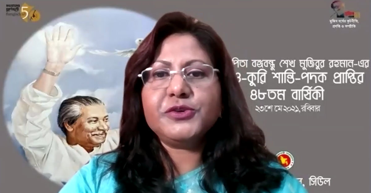 রাষ্ট্রদূত আবিদা ইসলামের সভাপতিত্বে আলোচনার শুরুতে বঙ্গবন্ধু শেখ মুজিবুর রহমানের ‘জুলিও কুরি’ শান্তি পুরস্কার প্রাপ্তির ৪৮তম বার্ষিকী উপলক্ষে একটি প্রামাণ্যচিত্র প্রদর্শন করা হয়। আবিদা ইসলাম তার বক্তব্যে ১৯৭৩ সালের ২৩ মে বিশ্ব শান্তি পরিষদ কর্তৃক বঙ্গবন্ধু শেখ মুজিবুর রহমানকে ‘জুলিও কুরি’ শান্তি পদক প্রদানের প্রেক্ষাপট তুলে ধরেন। পাশাপাশি বিশ্ব শান্তি প্রতিষ্ঠায় জাতির পিতার অসামান্য অবদানের কথা স্মরণ করেন।