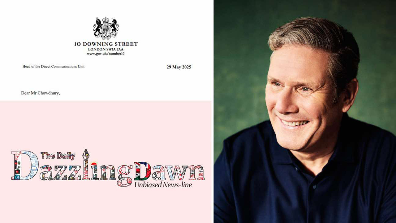 ব্রিটিশ প্রধানমন্ত্রীর কার্যালয় ১০ ডাউনিং স্ট্রিট থেকে, ২৯ মে ২০২৫ তারিখে প্রধানমন্ত্রীর ডিরেক্ট কমিউনিকেশনস ইউনিটের প্রধানের ডেইলি ড্যাজলিং ডনের প্রতিষ্ঠাতা ও প্রকাশক মুনজের আহমেদ চৌধুরীর কাছে পাঠানো ব্রিটিশ সরকারের আনুষ্ঠানিক চিঠিতে ‘ডেইলি ড্যাজলিং ডন-এর অব্যাহত সাফল্যের জন্য শুভকামনা’ জানানো হয়েছে। প্রধানমন্ত্রীর শুভ কামনা জানানো চিঠিতে বলা হয়, ডেইলি ড্যাজলিং ডন পত্রিকাটি এত বিপুল সংখ্যক পাঠকের কাছে যেভাবে পৌঁছাতে পেরেছে, তা তিনি জেনেছেন।