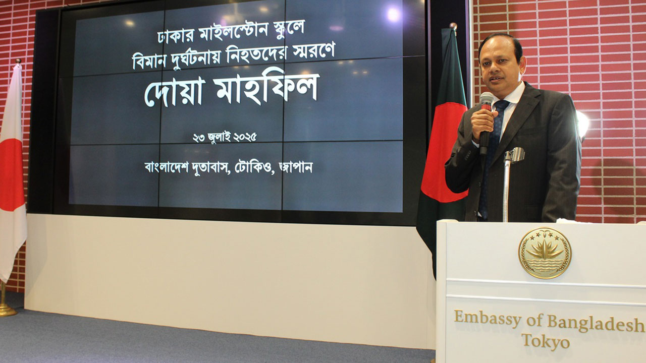 ঢাকার মাইলস্টোন স্কুল অ্যান্ড কলেজে বিমান দুর্ঘটনায় নিহতদের স্মরণে দোয়া মাহফিলের আয়োজন করে টোকিওর বাংলাদেশ দূতাবাস।