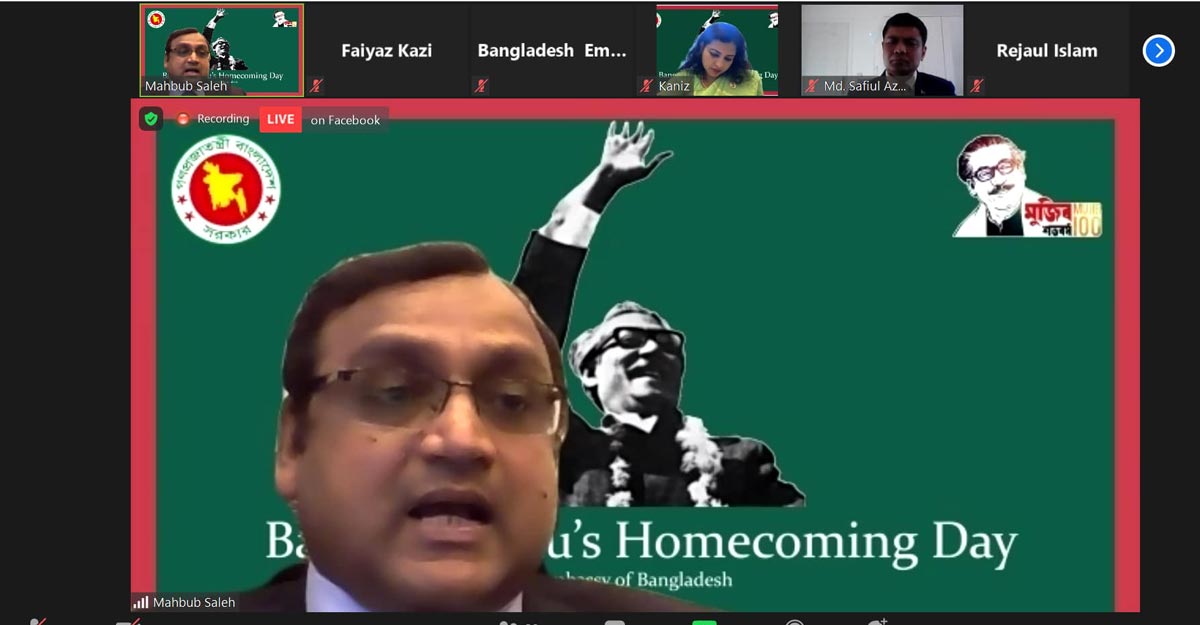 রোববার (১০ জানুয়ারি) রাতে ব্রাসেলেসের বাংলাদেশ দূতাবাসের আয়োজনে বঙ্গবন্ধুর স্বদেশ প্রত্যাবর্তন উপলক্ষে ‘স্বাধীন দেশ নিয়ে বঙ্গবন্ধুর লক্ষ্য’ শীর্ষক এক ভার্চুয়াল অনুষ্ঠানে এসব কথা বলেন রাষ্ট্রদূত মাহবুব সালেহ।