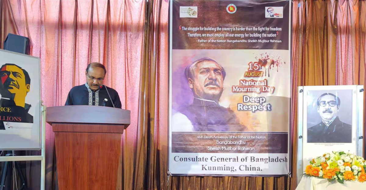 চীনে কুনমিংয়ে বাংলাদেশ কনস্যুলেট জেনারেলের উদ্যোগে রোববার (১৫ আগস্ট) জাতির পিতা বঙ্গবন্ধু শেখ মুজিবুর রহমানের ৪৬তম শাহাদত বার্ষিকী ও জাতীয় শোক দিবস যথাযোগ্য মর্যাদায় পালন করা হয়।