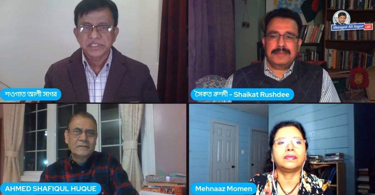 কানাডার বাংলা পত্রিকা ‘নতুনদেশ’ এর প্রধান সম্পাদক শওগাত আলী সাগরের সঞ্চালনায় আলোচনায় অংশ নেন কানাডার ম্যাকমাস্টার ইউনিভার্সিটির রাজনীতি বিজ্ঞানের অধ্যাপক ড. আহমেদ শফিকুল হক, টেক্সাসের এ অ্যান্ড এম ইন্টারন্যাশনাল ইউনিভার্সিটির রাজনীতি বিজ্ঞানের সহযোগী অধ্যাপক ড. মেহনাজ মোমেন এবং কানাডাভিত্তিক আন্তর্জাতিক গণমাধ্যম পর্যবেক্ষণ প্রতিষ্ঠানের মূল্যায়ন সম্পাদক, গণমাধ্যম বিশ্লেষক ও সাংবাদিক সৈকত রুশদী।
