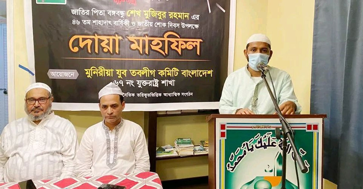 জাতির পিতা বঙ্গবন্ধু শেখ মুজিবুর রহমানের ৪৬তম শাহাদাতবার্ষিকী ও জাতীয় শোক দিবস উপলক্ষে খতমে কোরআন ও দোয়া মাহফিলের আয়োজন করেছে মুনিরীয়া যুব তবলীগ কমিটি বাংলাদেশ ৬৭ নং যুক্তরাষ্ট্র শাখা। গত ২১ আগস্ট (শনিবার) স্বাস্থ্যবিধি মেনে কমিটি কার্যালয়ে এ মাহফিলের আয়োজন করা হয়।