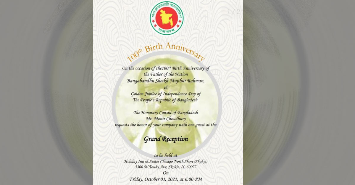 বাংলাদেশের অভাবনীয় উন্নয়ন ও স্বাধীনতার ৫০ বছরকে উদযাপনের জন্য বাংলাদেশ কনস্যুলেট অব ইলিনয়েসের গ্রান্ড রিসেপশনে বিশ্বের ১০০টি দেশের রাষ্ট্রদূত, কনসাল জেনারেলসহ ২০০ ভিআইপি অতিথি উপস্থিত থাকবেন। ১ অক্টোবর (শুক্রবার) সন্ধ্যা ৬টায় শিকাগোর হলিডে ইন অ্যান্ড স্যুট শিকাগো নর্থ শোরে (স্কোকি) তিন পর্বের এ গ্রান্ড রিসেপশন অনুষ্ঠিত হবে।