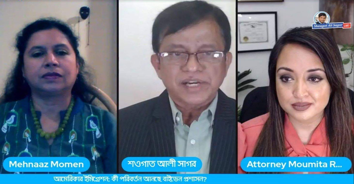 আলোচনায় অংশ নেন যুক্তরাষ্ট্রের টেক্সাস এ অ্যান্ড এম ইউনিভার্সিটির রাজনীতি বিজ্ঞানের অধ্যাপক ও মার্কিন ইমিগ্রেশন বিষয়ক গবেষক ড. মেহনাজ মোমেন এবং নিউইয়র্কের ইমিগ্রেশন অ্যাটর্নি মৌমিতা রহমান। কানাডার টরন্টোর স্থানীয় সময় বুধবার (২৭ জানুয়ারি) রাতে সামাজিক যোগাযোগ মাধ্যমে সরাসরি এই আলোচনা সম্প্রচারিত হয়।