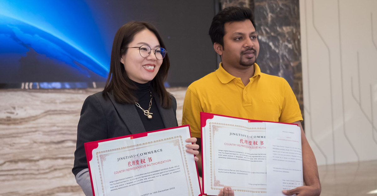 ইউ ইঔ এক্সপোর্ট অ্যান্ড ইমপোর্ট কোম্পানি লিমিটেডের পক্ষে কোম্পানির সিইও মোহাম্মদ ছাইয়েদুল ইসলাম এবং চিয়াংশি চিংথিয়ান ই-কমার্স কোম্পানি লিমিটেডের পক্ষে কোম্পানির চেয়ারম্যান ঝাং হুয়ান হুয়ান চুত্তিতে স্বাক্ষর করেন।