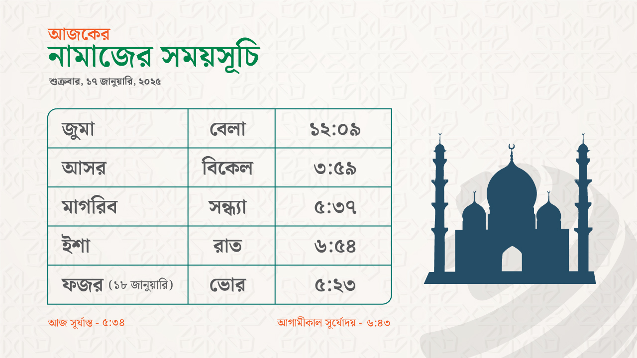 নামাজের সময়সূচি - ১৭ জানুয়ারি ২০২৫