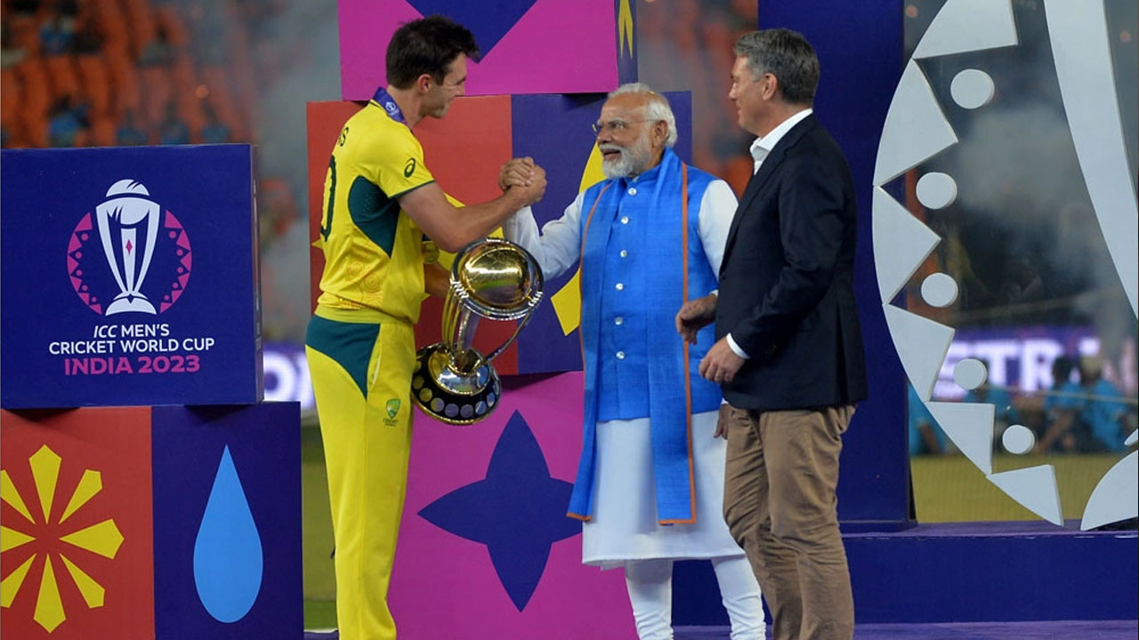 এ দিকে খেলা শেষ হওয়ার আগেই স্টেডিয়ামে উপস্থিত হন ভারতের প্রধানমন্ত্রী। গ্যালারিতে বসেছিলেন কেন্দ্রীয় স্বরাষ্ট্রমন্ত্রী অমিত শাহের সঙ্গে। অপেক্ষায় ছিলেন ট্রফি হস্তান্তর অনুষ্ঠানের জন্য। খেলা শেষে বিজয়ী অস্ট্রেলিয়ার অধিনায়ক প্যাট কামিন্সের হাতে ট্রফি তুলে দেওয়ার জন্য মঞ্চে ওঠেন মোদি। তিনি মঞ্চে ওঠার পরে একটু চিৎকার হলেও তা টেলিভিশনের দর্শকের কান পর্যন্ত যেতে কষ্টই হচ্ছিল খানিকটা। এর চেয়ে তার জনসভায় কয়েকগুণ মানুষ হয়। আক্ষেপ বুঝতে না দিয়ে অনেকটা খালি স্টেডিয়ামে কোহলিদের বদলে ট্রফি তুলে দেন কামিন্সের হাতে।