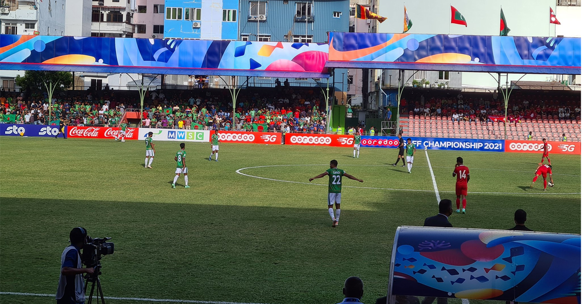 ম্যাচ শুরুর দশ মিনিট পরেই গর্জে উঠল মালে স্টেডিয়াম। বাঁপ্রান্ত থেকে রাকিব বল নিয়ে এগিয়ে যাচ্ছিলেন, নেপালের ডিফেন্ডার তাকে বাঁধা দিলে পড়ে যান। উজবেকিস্তানের রেফারি ফাউলের বাঁশি বাজান। অধিনায়ক জামাল ভূঁইয়ার ফ্রি কিক থেকে বক্সে জটলার মধ্যে হেড করেন সুমন রেজা।