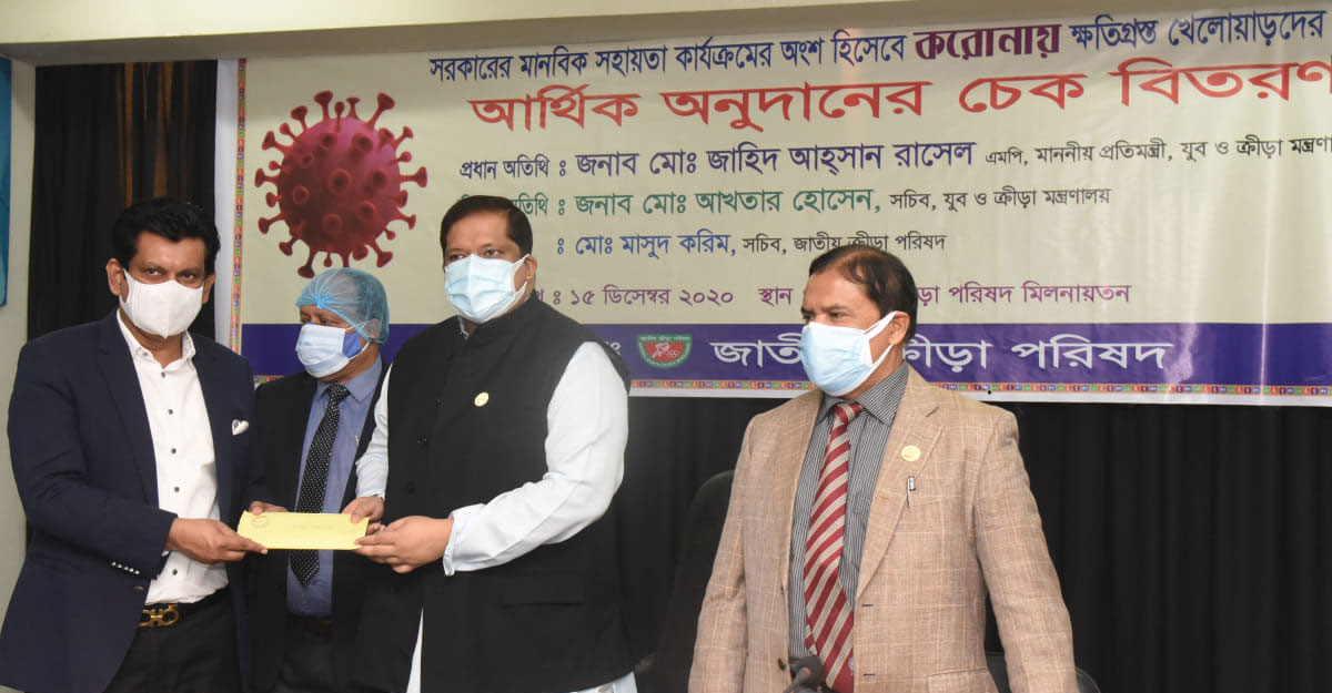 করোনায় ক্ষতিগ্রস্ত এক হাজার ক্রীড়াবিদকে আর্থিক সহায়তা প্রদানের লক্ষ্যে দেশের বিভিন্ন ক্রীড়া ফেডারেশনের প্রতিনিধিবৃন্দের হাতে ৭০ লাখ টাকার চেক দিয়েছেন যুব ও ক্রীড়া প্রতিমন্ত্রী মোঃ জাহিদ আহসান রাসেল। সরকারের ধারাবাহিক সহযোগিতার অংশ হিসেবে করোনায় ক্ষতিগ্রস্ত আরও এক হাজার ক্রীড়াবিদকে ৭ হাজার টাকা করে প্রদান করা হচ্ছে ।