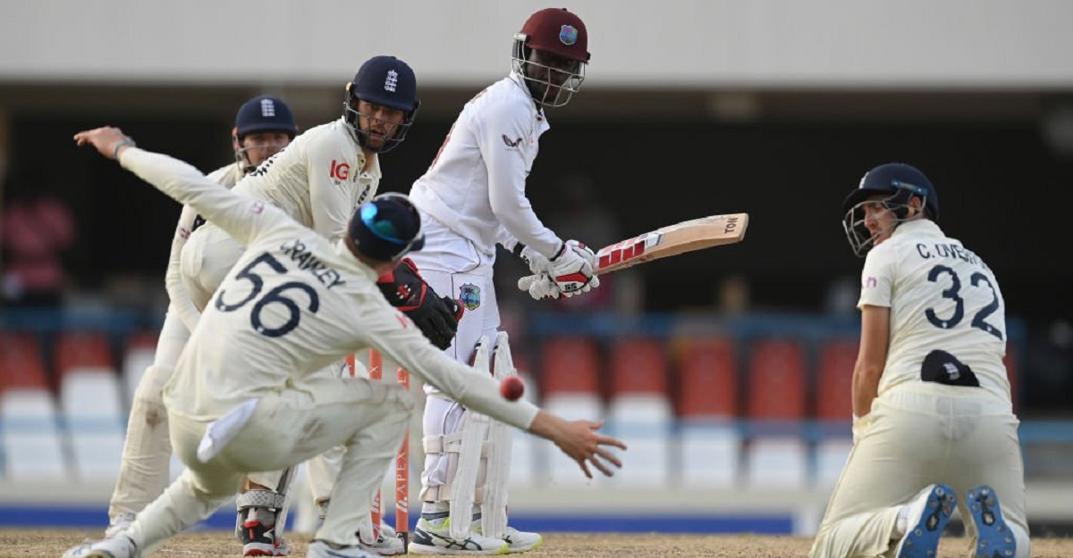 দুই সেশন হাতে রেখে ইংলিশরা স্বাগতিকদের সামনে একটা চ্যালেঞ্জই ছুঁড়ে দিয়েছিল। তবে উইন্ডিজ শুরু থেকেই সে চ্যালেঞ্জ থেকে ছিল নিরাপদ দূরত্বে। জন ক্যাম্পবেল আর ক্রেইগ ব্র্যাথওয়েট মিলে সেটা করছিলেনও ২৫ ওভার ধরে। দারুণ ভাবে সামলেছেন ইংলিশ বোলিং আর জো রুটের উদ্ভট ফিল্ড সেটআপকে। তবে এরপরই বেন স্টোকসের অস্বাভাবিক নিচু এক বলের লাইন মিস করে এলবিডব্লিউর ফাঁদে পড়েন ব্র্যাথওয়েট। জ্যাক লিচের পরের ওভারেই যখন ফিরলেন ক্যাম্পবেল, তখন মনে হচ্ছিল এই বুঝি ক্যারিবীয়দের ভাঙনের শুরু।