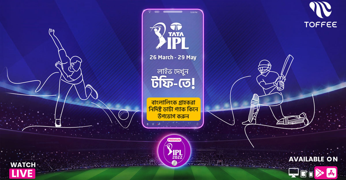দেশের জনপ্রিয় ডিজিটাল এন্টারটেইনমেন্ট অ্যাপ টফি-তে ইন্ডিয়ান প্রিমিয়ার লিগ-আইপিএল এর ২০২২ সিজনের ম্যাচগুলো সরাসরি দেখা যাবে। ম্যাচগুলো সরাসরি উপভোগ করা যাবে অ্যান্ড্রয়েড ও আইওএস মোবাইল ডিভাইস ও অ্যান্ড্রয়েড টিভিতে টফি অ্যাপে।