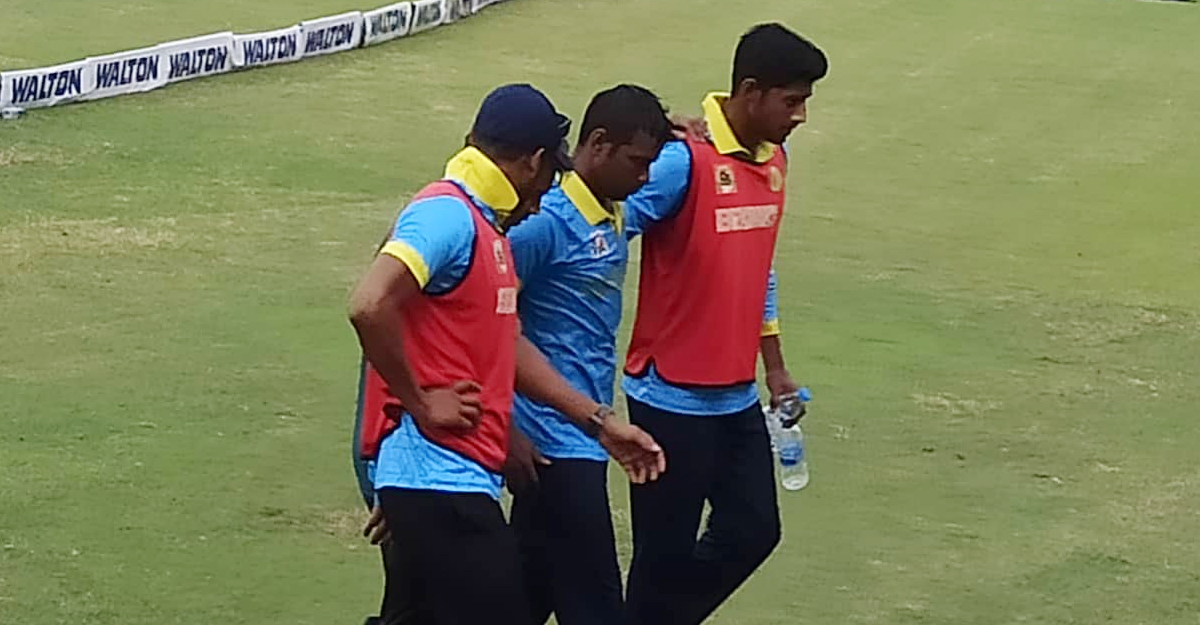 হঠাৎ কী এমন হলো যে এভাবে মাটিতে পড়ে গেলেন তানভীর? তার দল আবাহনী লিমিটেডের ম্যানেজার মাসুদ ইকবাল মামুন জানালেন, অতিষ্ঠ গরম সহ্য করতে না পেরে মাটিতে লুটিয়ে পড়েন এই বাঁহাতি স্পিনার।