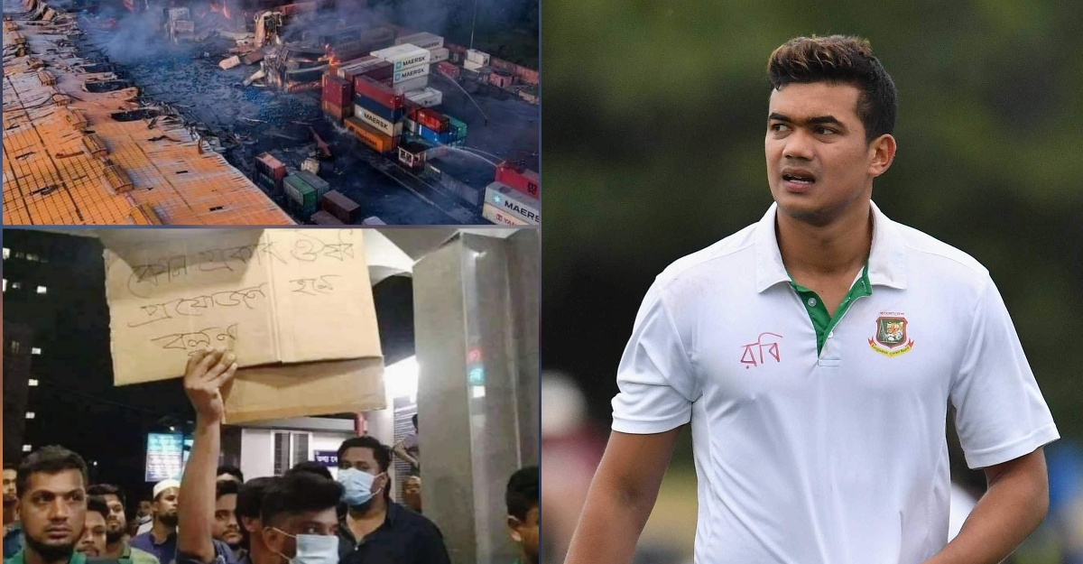 এই ক্যাপশনের সঙ্গে কোলাজ করা ছবি জুড়ে দিয়েছেন তাসকিন। ছবির একটিতে অগ্নিকাণ্ডে ভস্মীভূত হওয়া কন্টেইনার ডিপো এবং অপরটিতে আহতদের জন্য ওষুধ চেয়ে হাসপাতালের বাইরে প্ল্যাকার্ড হাতে দাড়িয়ে থাকা এক স্বেচ্ছাসেবককে দেখা যাচ্ছে।
