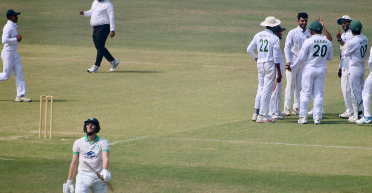 টস জিতে প্রথমে ব্যাটিংয়ের সিদ্ধান্ত নিয়েছিল আয়ারল্যান্ড উলভস। পঞ্চাশের আগেই তিন উইকেট হারিয়ে পায় শুরুর ধাক্কা। পুরো দিনেও আর সেটা কাটিয়ে উঠতে পারেনি সফরকারীরা। সর্বোচ্চ ৯২ বলে ৩৮ রান আসে কুটিস ক্যাম্পারের ব্যাট থেকে। তাকে আউট করেন সাইফ হাসান।