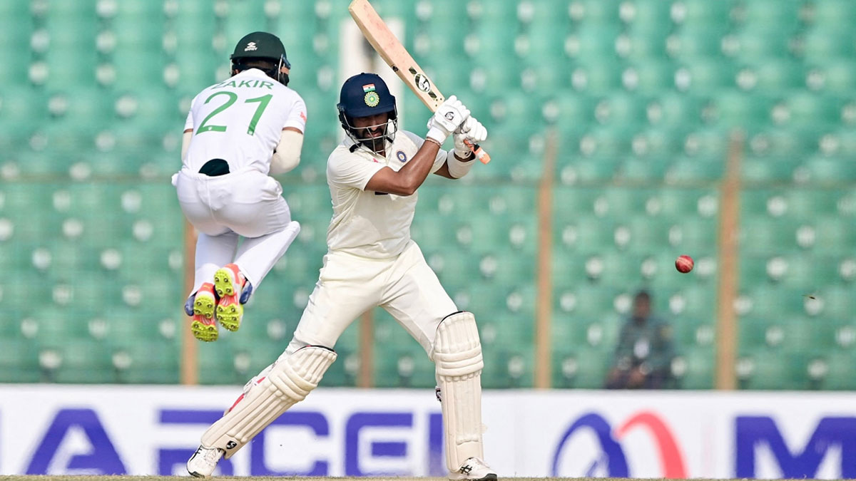 দলীয় ৭০ রানের মাথায় ভারতীয় অধিনায়ক লোকেশ রাহুলকে ফেরান টাইগার পেসার এবাদত। ২৩ রানে থাকা তিনি পুল শট খেলতে গিয়ে তাইজুলের দারুণ ক্যাচে ফিরে যান। এরপরই শুরু পূজারা-শুভমানের প্রতিরোধের।