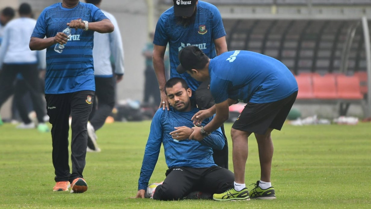 মাঠে অনুশীলনের সময় পেসার হাসান মাহমুদের একটি কিক হঠাৎ করে এসে লাগে মিরাজের মুখে। এরপর মুখে হাত দিয়ে মাঠেই বসে পড়েন এই অলরাউন্ডার। ফিজিও বাইজিদুল ইসলাম এসে কিছুক্ষণ দেখাশোনা করেন, পরে মিরাজকে নিয়ে যাওয়া হয় হাসপাতালে।