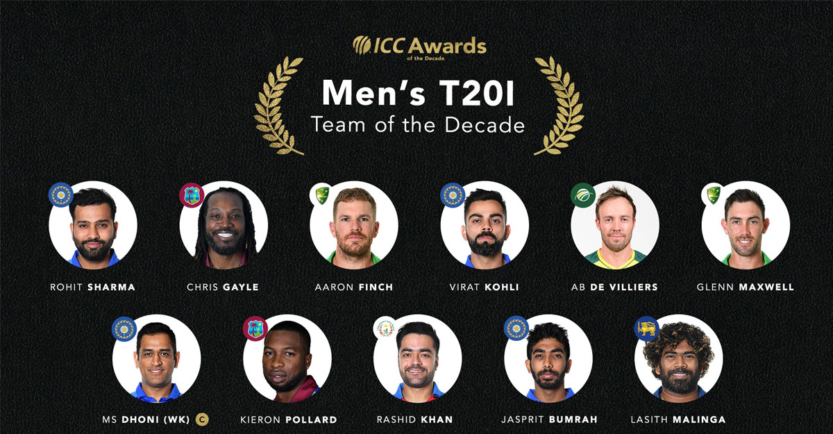 আইসিসির দশক সেরা টি-টোয়েন্টি একাদশ : ক্রিস গেইল (ওয়েস্ট ইন্ডিজ), রোহিত শর্মা (ভারত), অ্যারন ফিঞ্চ (অস্ট্রেলিয়া), বিরাট কোহলি (ভারত), এবিডি ভিলিয়ার্স (দক্ষিণ আফ্রিকা), গ্লেন ম্যাক্সওয়েল (অস্ট্রেলিয়া), মহেন্দ্র সিং ধোনি (ভারত), কাইরন পোলার্ড (ওয়েস্ট ইন্ডিজ), রশিদ খান (আফগানিস্তান), জসপ্রিত বুমরাহ (ভারত) ও লাসিথ মালিঙ্গা (শ্রীলঙ্কা)।