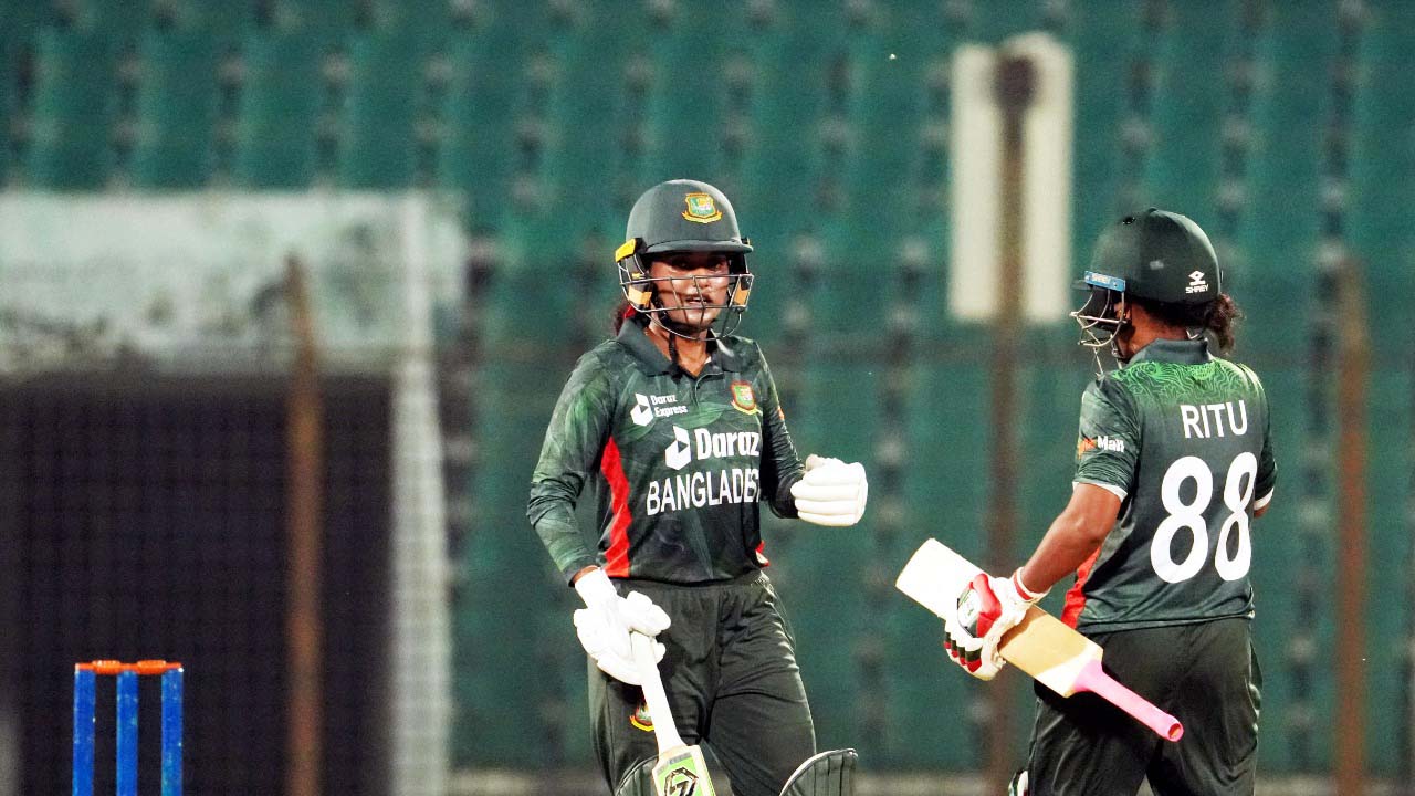 স্বর্ণা-রিতুর জুটি ভাঙে ৩৮ রানে। রিতু ১৯ রান করে ফিরে যান। তবে ইনিংসের শেষ বল পর্যন্ত ব্যক্তিগত ২৭ রানে অপরাজিত থেকে মাঠ ছাড়েন স্বর্ণা। নির্ধারিত ওভার শেষে ৬ উইকেট হারানো বাংলাদেশের সংগ্রহ দাঁড়ায় ১২০ রান।