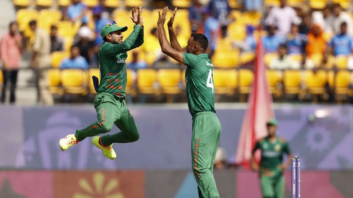 বৃষ্টির পর ব্যাট করতে নেমে শুরুতেই বড় ধাক্কা খায় নিউজিল্যান্ড। ইনিংসের প্রথম ওভারেই কিউই শিবিরে জোড়া আঘাত হানেন শরিফুল ইসলাম। চতুর্থ বলটি অফ স্টাম্পের ওপর গুড লেংথে করেছিলেন এই বাঁহাতি পেসার। আউট সুইং করে বল বের হয়ে যাওয়ার সময় রাচিন রবীন্দ্রের ব্যাটের বাইরের দিকের কানায় লেগে মুশফিকের গ্লাভসে জমা পড়ে। বিশ্বকাপে দুর্দান্ত পারফর্ম করা এই ওপেনার সাজঘরে ফেরেন ডাক খেয়ে।