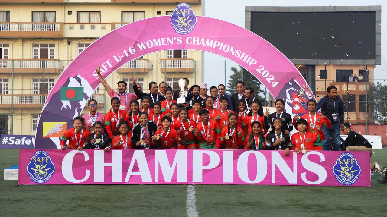 দক্ষিণ এশিয়ার বয়সভিত্তিক প্রতিযোগিতায় বাংলাদেশের নারীদের জয়রথ চলছেই। গত মাসে সাফ অনূর্ধ্ব-১৯ টুর্নামেন্টে যুগ্ম শিরোপার পর এবার সাফ অ-১৬ টুর্নামেন্টে একক শিরোপা। গতকাল টাইব্রেকারে ভারতকে হারিয়ে নেপালের মাটিতে চ্যাম্পিয়নের উল্লাস করেছে বাংলাদেশ।