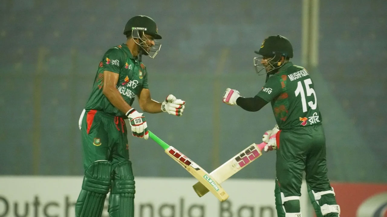 জবাবে খেলতে নেমে ৪৪.৪ ওভারে ৪ উইকেট হারিয়ে জয়ের বন্দরে পৌঁছে যায় বাংলাদেশ। দলের হয়ে সর্বোচ্চ অপরাজিত ১২২ রান করেছেন শান্ত। তাছাড়া মুশফিকের ব্যাট থেকে এসেছে অপরাজিত ৭৩ রান।