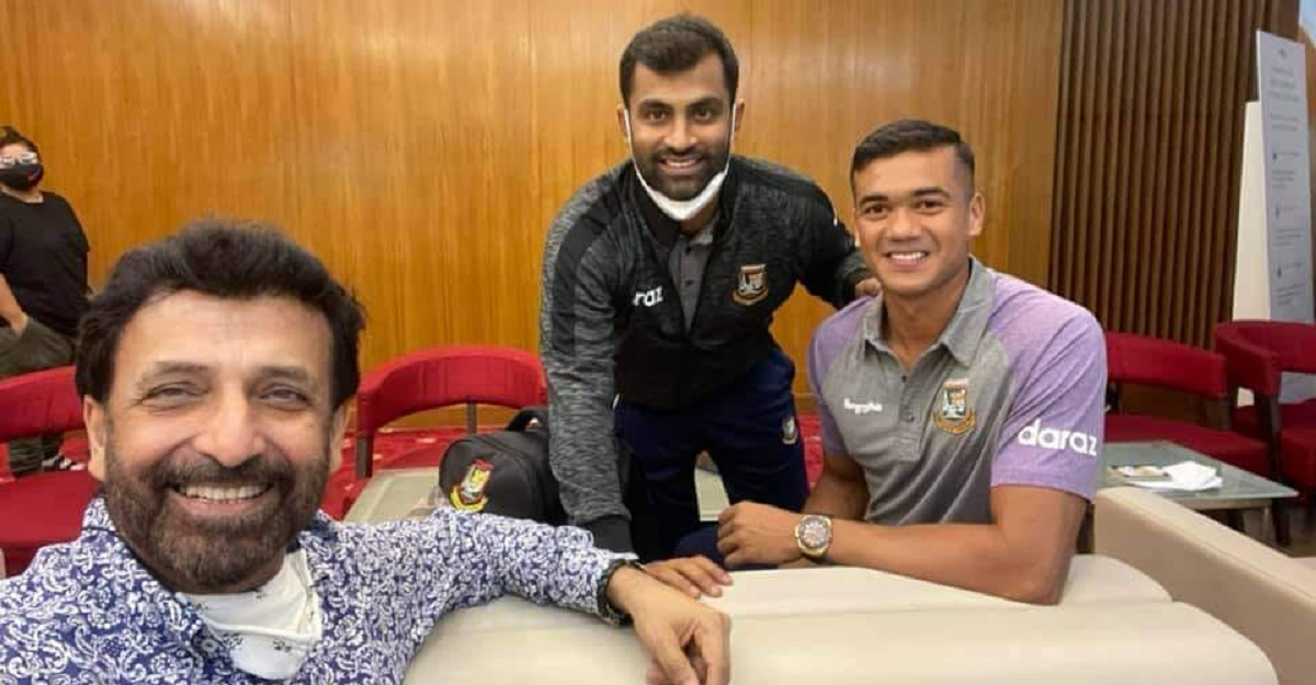 যাত্রার প্রাক্কালে ধারাভাষ্যকার আতহার আলি খানের সঙ্গে তামিম ইকবাল ও তাসকিন আহমেদ/ফেসবুক