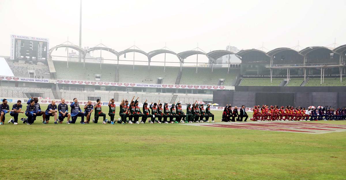 প্রথম বল মাঠে গড়ানোর আগে ব্যাটিং, ফিল্ডিং দলের পাশাপাশি ম্যাচ অফিশিয়ালরাও নিজ নিজ জায়গায় অবস্থান করে একযোগ হাঁটু গেড়ে প্রতিবাদ জানান। ১ মিনিট ধরে চলা এই প্রতিবাদের পর শুরু হয়ে দুই দলের মাঠের লড়াই।