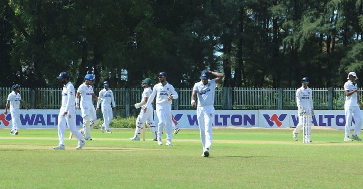 পরে নিজেদের প্রথম ইনিংসে ব্যাট করতে নেমে পঞ্চাশ রানের গণ্ডি পার করার আগেই ৪ উইকেট হারিয়ে বসে ঢাকা বিভাগ। ওপেনার আব্দুল মাজিদ ৩৫ রান করে আউট হলে বিপদ বাড়ে দলটির। তবে শুভাগত হোম চৌধুরীর অর্ধশতকে লিড পায় ঢাকা। জাতীয় দলের এই অলরাউন্ডার খেলেন ৬৯ বলে ৫০ রানের ইনিংস। উইকেটরক্ষক মাহিদুল ইসলাম অঙ্কনের ব্যাট থেকে আসে ৪৭ রান।