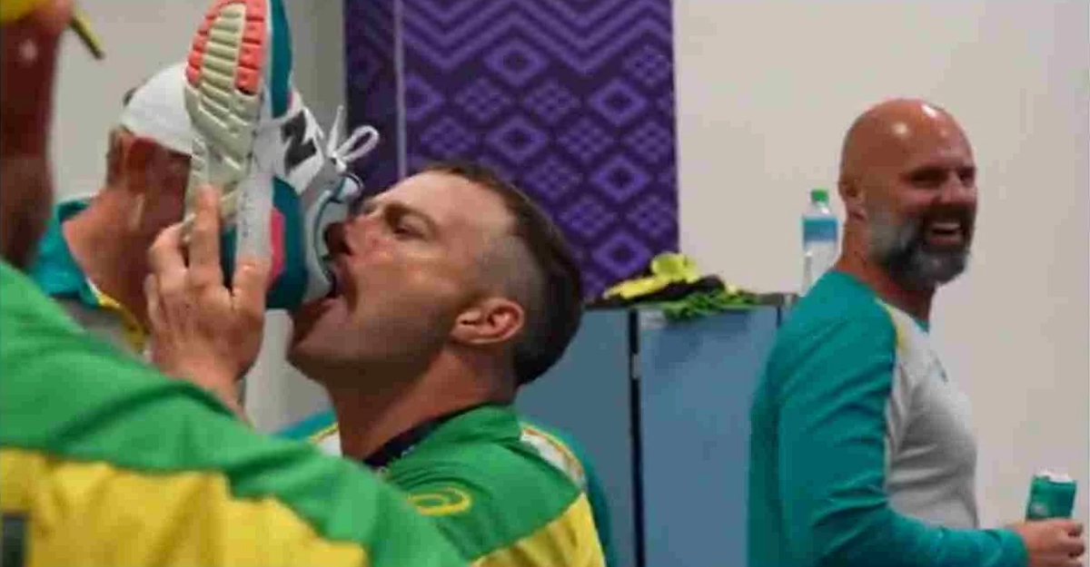এরপর শুরু জুতোয় মদ নিয়ে খেয়ে উদযাপনের। শুরুটা করেছিলেন অজি উইকেটরক্ষক ব্যাটার ম্যাথু ওয়েড। তিনিই প্রথম জুতো খুলে তাতে বিয়ার নিয়ে খাওয়া শুরু করেন। তার দেখাদেখি সতীর্থ মার্কাস স্টয়নিসকেও দেখা যায় যোগ দিতে।