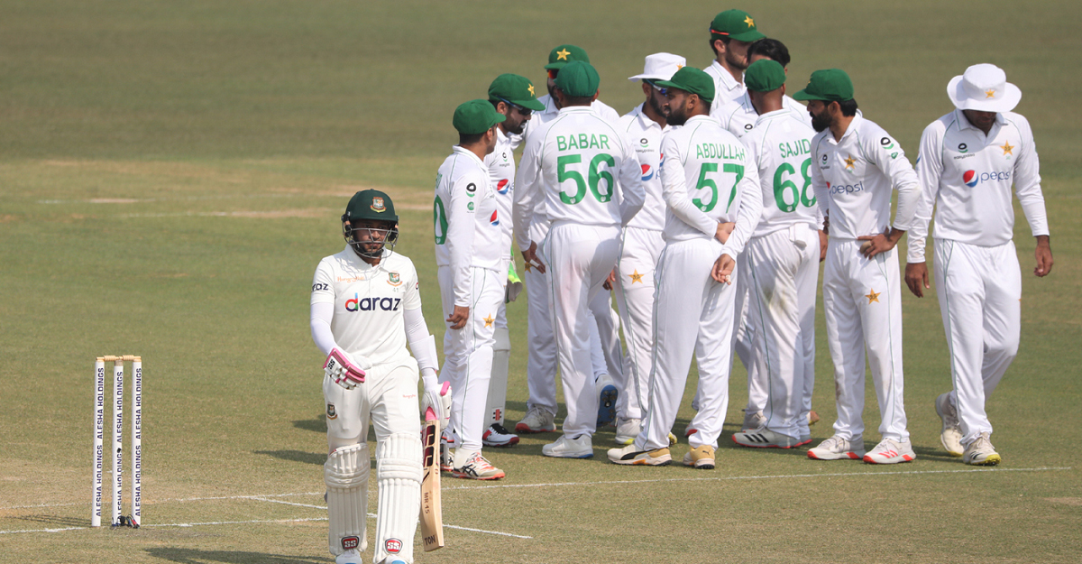 স্কোর বোর্ডে বড় সংগ্রহ নিয়ে ইনিংস ঘোষণার স্বপ্নে বিভোর বাংলাদেশ দল দ্বিতীয় দিনে কুপোকাত পাকিস্তানি পেসার হাসান আলীর কাছে। আগের দিনে ১ উইকেট নেওয়া এই পেসার জানিয়েছিলেন, ৩৫০ রানের মধ্যে অলআউট করতে চান অধিনায়ক মুনিমুল হকের দলকে। সেই হাসানই আজ বল হাতে নেতৃত্ব দিলেন প্রতিপক্ষকে ধসিয়ে দিতে। আজ ৪ উইকেট নিয়ে ৫ উইকেটের স্বাদ পান তিনি।
