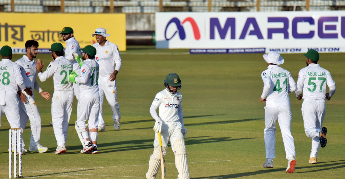 প্রথম ইনিংসে ৩৩০ রান তোলা বাংলাদেশ তাইজুল ইসলামের (৭ উইকেট) দুর্দান্ত বোলিং নৈপুণ্যে সফরকারীদের আটকে দেয় ২৮৬ রানে। এতে প্রথম ইনিংসে ৪৪ রানের লিড পায় লাল-সবুজের প্রতিনিধিরা। তৃতীয় দিনের শেষ সেশনে ব্যাট করতে নেমে শাহিন শাহ আফ্রিদি, হাসান আলিদের আগুনে বোলিংয়ে খেই হারাল বাংলাদেশ দলের টপ অর্ডার। অসহায় আত্মসমর্পণে ২৫ রান তুলতেই নেই ৪ উইকেট।