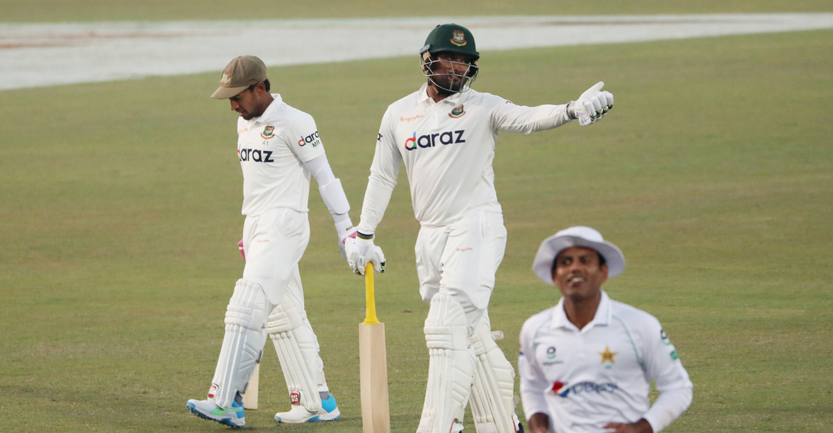 মুশফিক ১৬ রানে বিদায় নিলে ক্রিজে এসে ছন্দ খুঁজে পাচ্ছিলেন না লিটন দাস। উইকেট ছেড়ে খেলতে গিয়ে বিপদ বাধিয়ে বসেছিলেন। তবে ভাগ্য সুপ্রসন্ন থাকায় রিজওয়ান সহজ সুযোগ নষ্ট করেন। পরে রাব্বি-লিটনের জুটিতে ঘুরে দাঁড়ায় স্বাগতিক শিবির। আফ্রিদি-হাসান-নোমানদের পরিকল্পনা কাজে আসছিল না কিছুতেই। তবে রাব্বির মাথার চোট চিন্তা বাড়াল বাংলাদেশ দল। দারুণ ব্যাট করতে থাকা রাব্বি ছিটকে গেলেন ৩৬ রান করে।