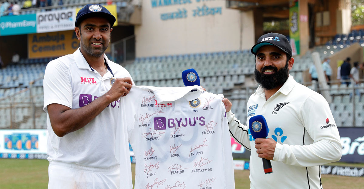 দ্বিতীয় টেস্ট জেতার পর বিসিসিআইয়ের অফিশিয়াল পেজ থেকে অশ্বিন ও এজাজের একটি ছবি পোস্ট করা হয়। যেখানে দেখা যায় স্বাক্ষর করা বিশেষ জার্সিটি কিউই স্পিনারের হাতে তুলে দিচ্ছেন অশ্বিন।
