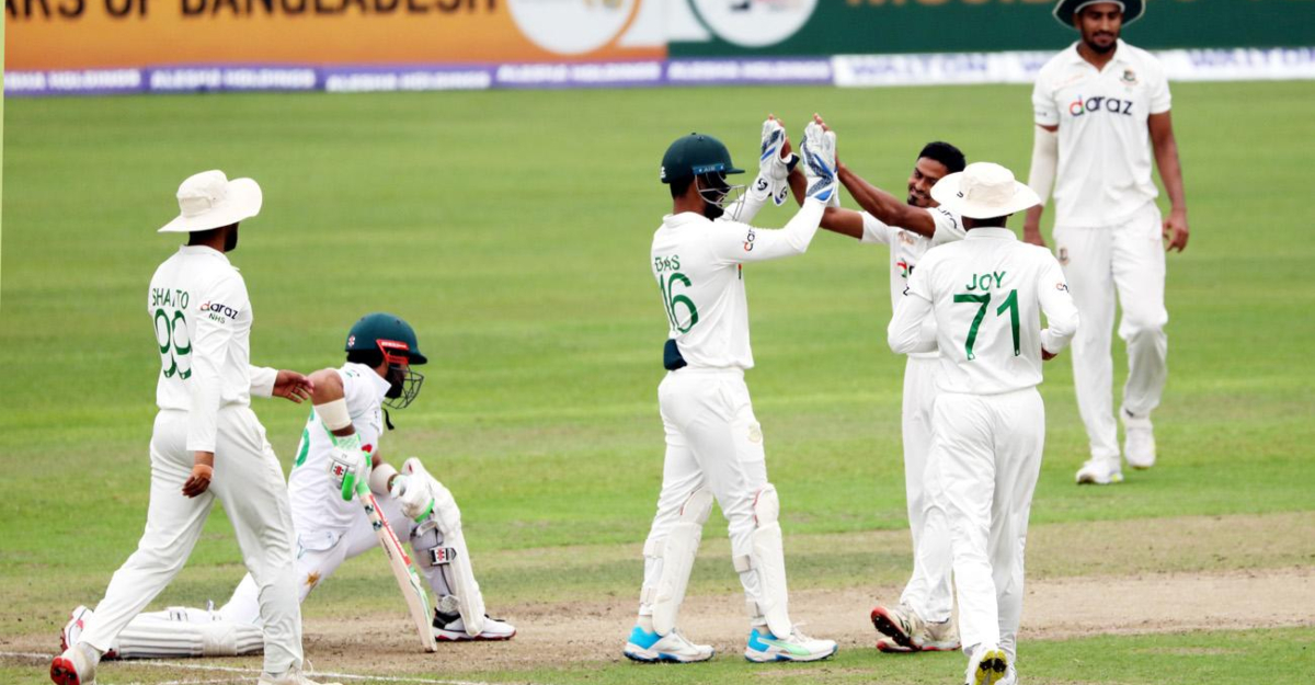প্রথম সেশনের মতো দ্বিতীয় সেশনেও দেখা যায়নি সূর্যের মুখ। সকালের মতো স্যাঁতস্যাঁতে আবহাওয়া দুপুরেও। তবে সকালে যে উত্তাপ ছড়ালেন খালেদ আহমেদ, এবাদত হোসেনরা সেটি ধরে রাখতে পারেননি দ্বিতীয় সেশনে। পেসারদের মতো নির্বিষ স্পিনাররাও। উইকেট থেকে সুবিধা পেলেও সাকিব আল হাসান, তাইজুল ইসলাম, মেহেদী হাসান মিরাজরা প্রতিপক্ষের ব্যাটসম্যানদের চ্যালেঞ্জ জানাতে পারেননি।
