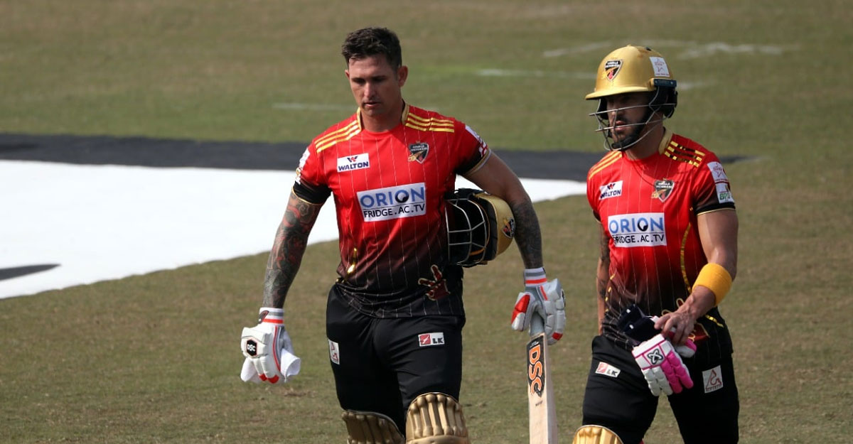 দুর্দান্ত ব্যাটিংয়ে ফিফটির দিকে ছুঁটছিলেন লিটন। তবে ইনিংসের ১১তম ওভারে নাসুমের বলে ধরা পড়েন সাব্বিরের হাতে। ৫টি চার ও ১টি ছয়ের মারে ৩৪ বলে ৪৭ রানে থামেন লিটন। চারে নেমে সুবিধা করতে পারেননি অধিনায়ক ইমরুল কায়েস। বেনি হাওয়েলের বলে বোল্ড হন ১ রান করে। এরপর ব্যাট হাতে ধ্বংসলীলা চালিয়ে ফিফটির স্বাদ পান ফাফ। তার সঙ্গে যোগ যেন তারই স্বদেশী দক্ষিণ আফ্রিকান ব্যাটসম্যান ক্যামেরুন ডেলপোর্ট।