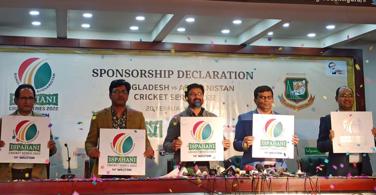 বাংলাদেশ-আফগান সিরিজের টাইটেল স্পন্সর ইস্পাহানী লিমিটেড। সঙ্গে পাওয়ার স্পন্সর হয়েছে ওয়ালটন গ্রুপ। রোববার দুপুরে মিরপুর শের-ই বাংলা জাতীয় ক্রিকেট স্টেডিয়ামের মিডিয়া কনফারেন্স রুমে এই সিরিজের লোগো উন্মোচন অনুষ্ঠানে টাইটেল স্পন্সর আর পাওয়ার স্পন্সরের নাম ঘোষণা করে ক্রিকেট বোর্ড।