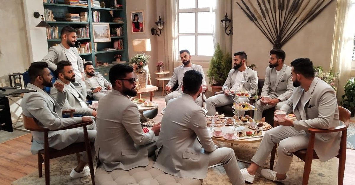 একটি চায়ের টেবিলের চারদিকে তারা বসে, এক জন অবশ্য দাঁড়িয়ে রয়েছেন। সবার গায়ে একই রকমের পোশাক। কারও হাতে চায়ের কাপ। কেউ আবার গল্পে মগ্ন। আরও একটি বিষয়ে সবার মিল আছে। সবার গালে চাপ দাড়ি। তারা প্রত্যেকেই বিরাট কোহলি।