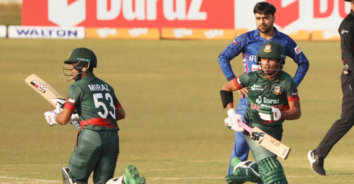 শুরুতে ফজলহক ফারুকির তোপে পড়ে বাংলাদেশ পাঁচ ওভারেই হারিয়ে ফেলে চার উইকেট। পাওয়ারপ্লে শেষ হওয়ার আগে সাকিব আল হাসানও ফিরলেন মুজিব উর রহমানকে কাট করতে গিয়ে বোল্ড হয়ে। এরপর পাওয়ারপ্লে শেষে ফিরলেন মাহমুদউল্লাহও। তখন শুরু আফিফ-মিরাজের লড়াইয়ের।