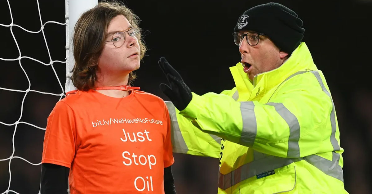 খেলার মাঝখানেই মাঠে নেমে পড়লেন এক তরুণ। শুধু নামলেনই না, গলা ফাঁস দিলেন গোলপোস্টের সঙ্গে। বুকে তার ‘জাস্ট স্টপ অয়েল’ লেখা টি-শার্ট। এমন ঘটনা ঘটেছে ইংলিশ প্রিমিয়ার লিগে এভারটন বনাম নিউক্যাসেল ম্যাচে। তাতে বন্ধ করতে হয়েছে ম্যাচও।