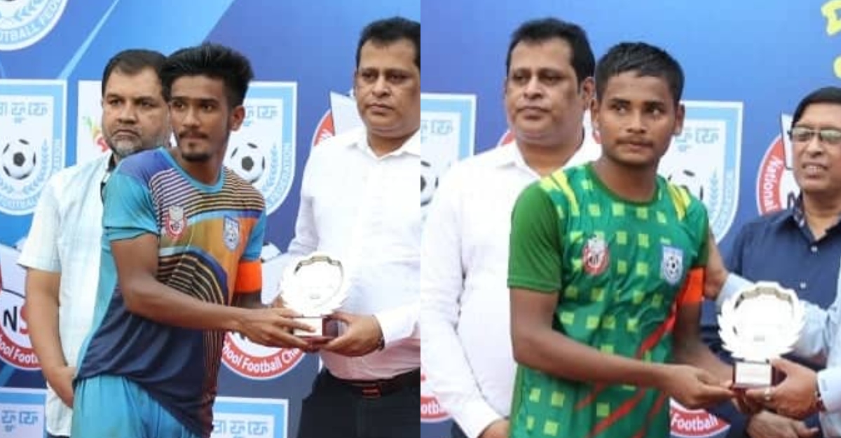 টুর্নামেন্টের সর্বোচ্চ গোলদাতা নীলফামারী অধিনায়ক নাইম ইসলাম (বাঁয়ে), ও সেরা খেলোয়াড় বেনাপোল অধিনায়ক সাইদুর রহমান রাহুল/বাফুফে
