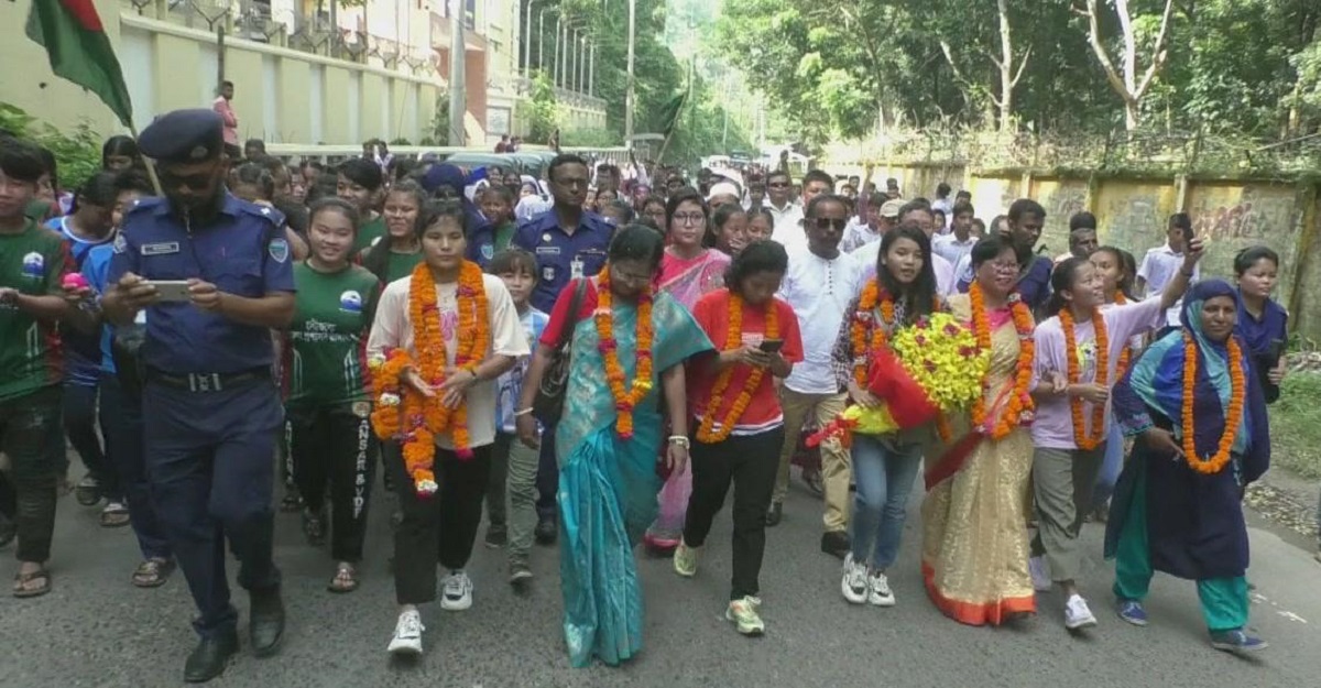 বিকাল চারটায় মেয়েদের নিয়ে ঘাগড়া থেকে খোলা ট্রাকে শোভাযাত্রা বের হবে। সেটা রাঙামাটি শহর প্রদক্ষিণ শেষে বিকাল পাঁচটায় রাঙামাটি চিং হ্লা মারী স্টেডিয়ামে যাবে। সেখানে রাঙামাটি পার্বত্য জেলা পরিষদ, জেলা প্রশাসনের ও জেলা পুলিশের পক্ষ থেকে সাফজয়ী পাঁচ খেলোয়াড়কে সংবর্ধনা দেওয়া হবে।